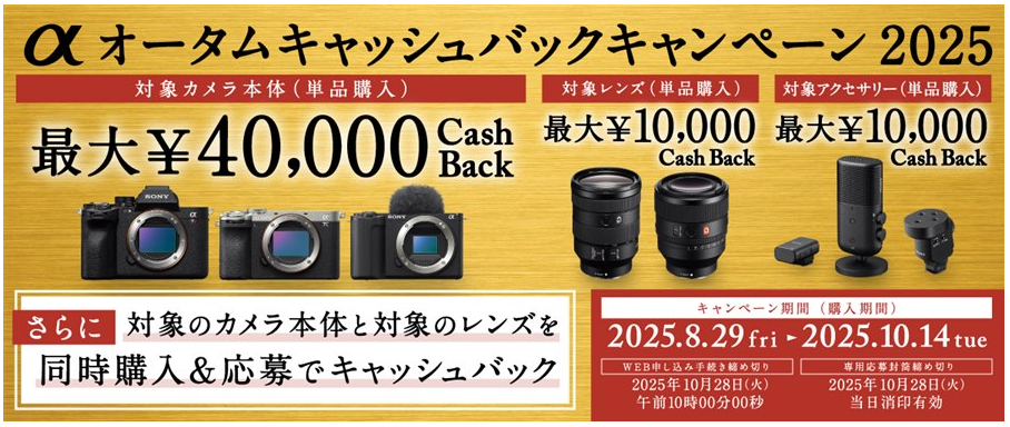 2025.09.02 Sony Launches Alpha Autumn Cashback Campaign 2025 Post Share Hatena Pocket RSS feedly Pin it COPY Title&URL Canon "Spring Cashback 2025" LUMIX Year-end and New Year Cashback Campaign Latest NewsInformation 2026.03.10 “LUMIX Spring Cashback Campaign” 2026.02.25 “α Spring Cashback Campaign 2026” 2026.02.18 Canon Spring Cashback 2026 2025.11.16 LUMIX Year-end and New Year Cashback Campaign 2025.03.20 Canon “Spring Cashback 2025”
